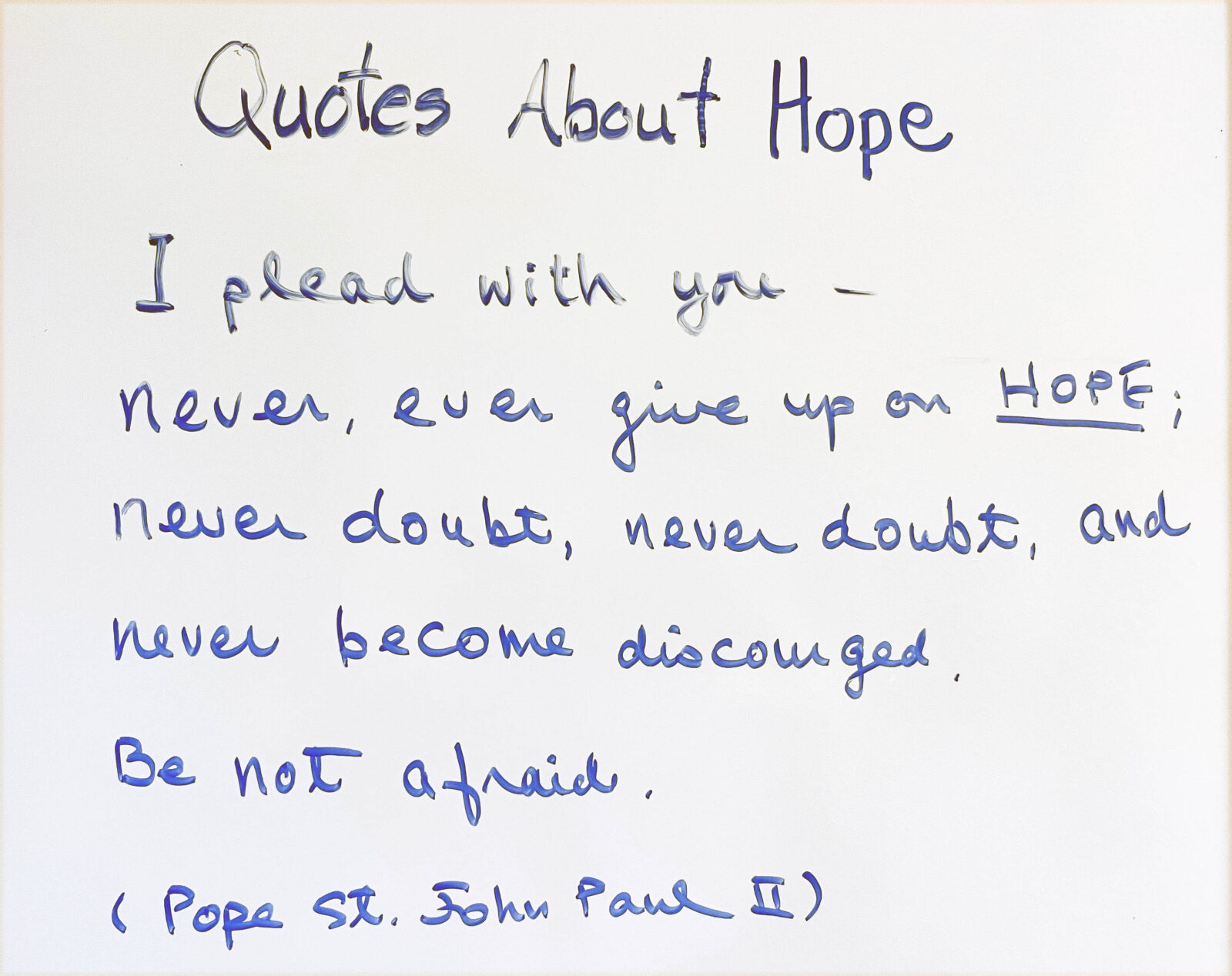Like all human families, our community too experiences joys and sorrows, and faces challenges such as illnesses. To nurture the virtue of hope, each week our sisters took turns putting a quote on hope on our notice board.